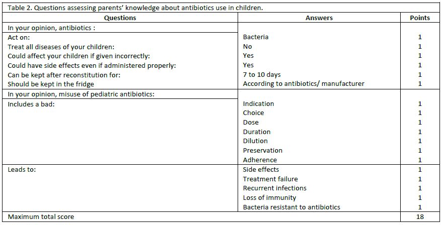 The parents’ questionnaire was prepared in Arabic, the native language in Lebanon. It first included a section on sociodemographic characteristics (i.e., gender, age, region, marital status, educational level, profession, family income, number of children). The second section evaluated the knowledge of parents regarding antibiotics use, spectrum of activity, side effects and risks, reconstitution and conservation, along with antibiotics misuse (i.e., definition, causes and consequences). Finally, we added some opinion questions on giving an antibiotic without a medical prescription.