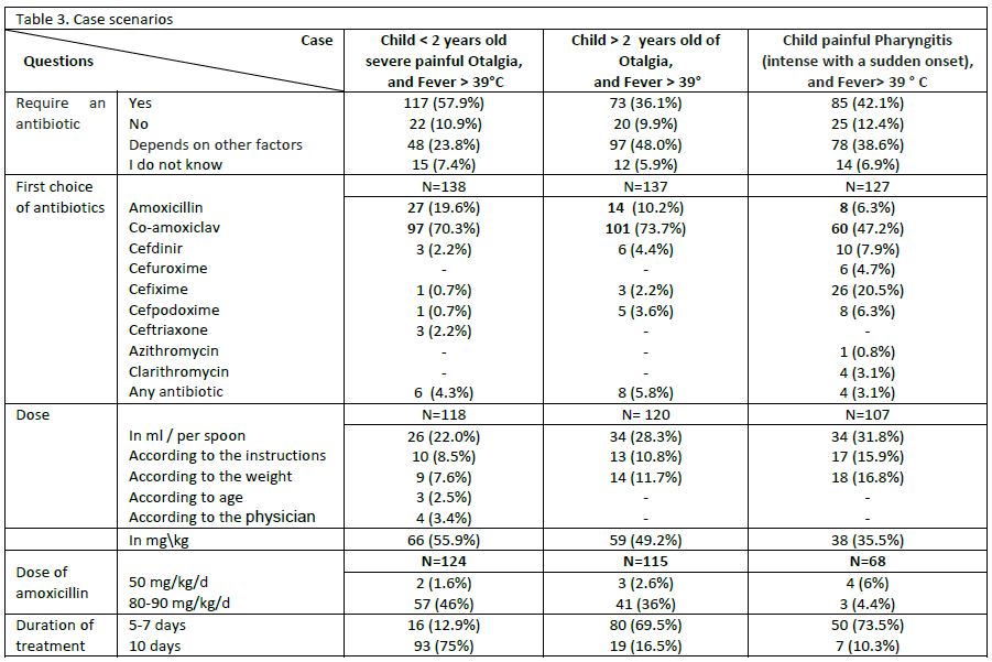 More than half of the pharmacists (57.9%) declared that a child <2 years, with severe painful otalgia, and fever >39°C requires an antibiotic. Amoxicillin/clavulanic acid was the first choice for 70.3% of pharmacists. Concerning the dose, 55.9% of the pharmacists confessed that the dose would be calculated according to the weight of the child. For amoxicillin or amoxicillin/clavulanic acid, 46% of pharmacists gave a dose of 80-90 mg/kg/day, for a duration of 10 days (75%).