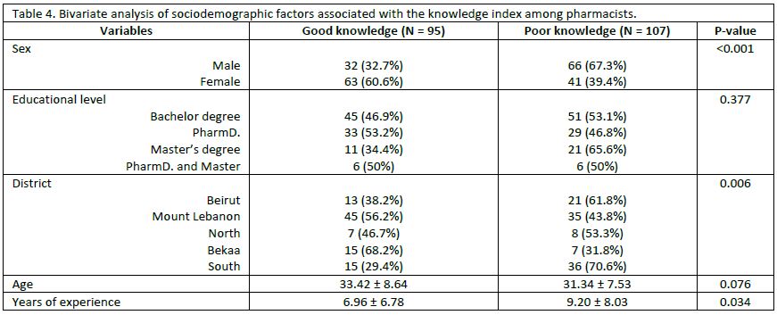 The bivariate analysis, taking the dichotomous pharmacists knowledge index (low vs high knowledge) as the dependent variable, showed that a significantly higher percentage of males had poor knowledge compared to their female counterparts (p<0.001), whereas a significantly higher percentage of pharmacists in Beirut and South had poor knowledge (p=0.006). In addition, a significantly higher mean number of years of experience was found in pharmacists with poor knowledge (p=0.034). No significant difference was found for the educational level nor age ( Table 4).
