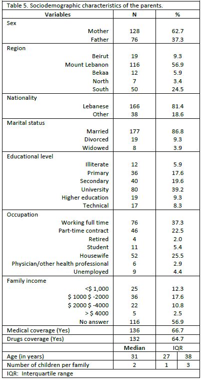 The sociodemographic characteristics of the parents are summarized in Table 5. Two hundred and four parents were finally included (62.7% females; median age 31 years, IQR 27 to 38 years) into the study. Half of them were university graduates or postgraduates and 13% were divorced or widowed.