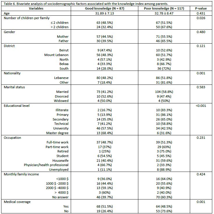 The bivariate analysis, taking the dichotomous parental knowledge index (low vs high knowledge) as the dependent variable, showed that a significantly higher percentage of parents with more than 2 children had poor knowledge compared to parents who had 2 children or less (p=0.026), whereas a significantly higher percentage of parents with poor knowledge was seen among illiterate or those with a primary level of education (p<0.001). No significant association was found between knowledge and age, gender, district, marital status, occupation, or monthly family income ( Table 6).