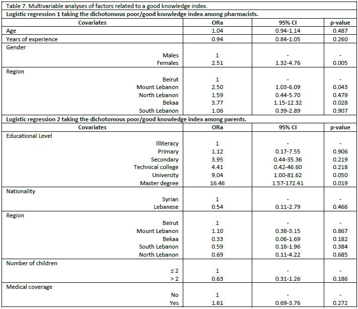 The results of a first logistic regression, taking the dichotomous pharmacists’ knowledge index as the dependent variable, showed that female pharmacists had a significantly higher knowledge index compared to their male counterparts (ORa=2.51), whereas those working in Mount Lebanon and Bekaa had a significantly higher knowledge index than those working in other regions (ORa=2.5 and ORa=3.77, respectively). The results of a second logistic regression, taking the dichotomous parents’ knowledge index as the dependent variable, showed that parents with a university level of education or a master’s degree had a significantly better knowledge compared to illiterate ones (ORa=9.04 and ORa=16.46, respectively) ( Table 7).