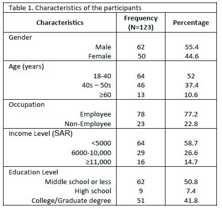 A total of 123 participants were recruited for the study and more than half (55.4%) were male ( Table 1). Sixty-one (50%) of the participants were patients from the university hospital, 26 (20%) were students from colleges and high schools and the remaining 36 (30%) were general people from coffee shops. More than three-quarters (77.2%) of the participants were employed and the majority (58.7%) had an income level of less than 5000 Saudi riyal a month. Education level was categorized into three categories: middle school or less (50.8%), high school (7.4%), and college/graduate degree (41.8%) ( Table 1).