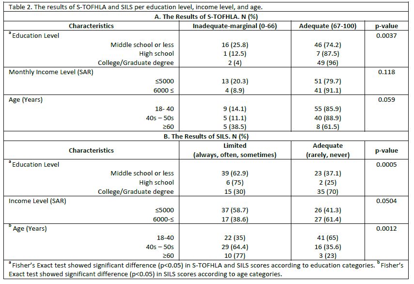 Results: More than half (55.4%) of the participants were male, 50.4% had a middle school or less education level, and we found that 84.4% had adequate health literacy as measured by the S-TOFHLA, compared to 49.6% as measured by SILS. The Fisher’s Exact test showed a significant difference (P<.05) in the S-TOFHLA and SILS scores according to education categories.