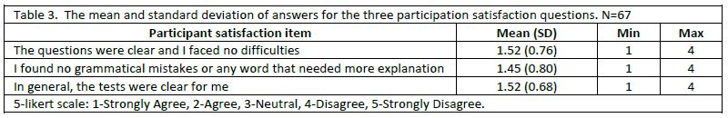 The answers for the three satisfaction questions showed the participants agreed upon the clarity of the two tests ( Table 3). The study has some limitations. Although the study used a convenience sample, the participants represent the general Saudi population from different settings with various levels of education. Thus, the study participants can represent the general Saudi population. Because the interview-time was short and there was no compensation, only 55% (67) of the participants answered the three satisfaction questions at the end of the tests. Finally, the study was conducted in one city.