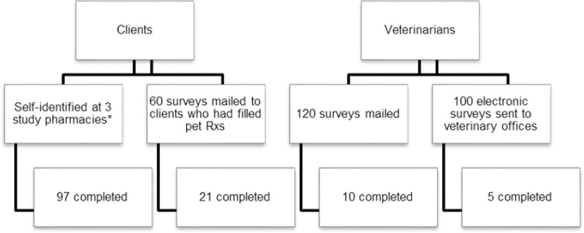 ). Pet owners are referred to as “clients” throughout this article to follow current veterinary medical terminology. Both surveys were pilot tested by five people prior to distribution.Signs were posted at the study pharmacies to encourage clients to self-identify and participate in the survey. Prescription fill history through myDataMart ® (Columbia, MD), a data analysis tool, was also used to identify prescriptions filled for pets at the study pharmacies. Pharmacy dispensing software allows designation of a patient as a pet; these reports included all prescriptions, whether compounded or commercially available prescriptions, and were used to mail surveys to identified clients. In addition, in-person surveys were given to clients at study pharmacies. Surveys were distributed via mail and email to veterinarians.