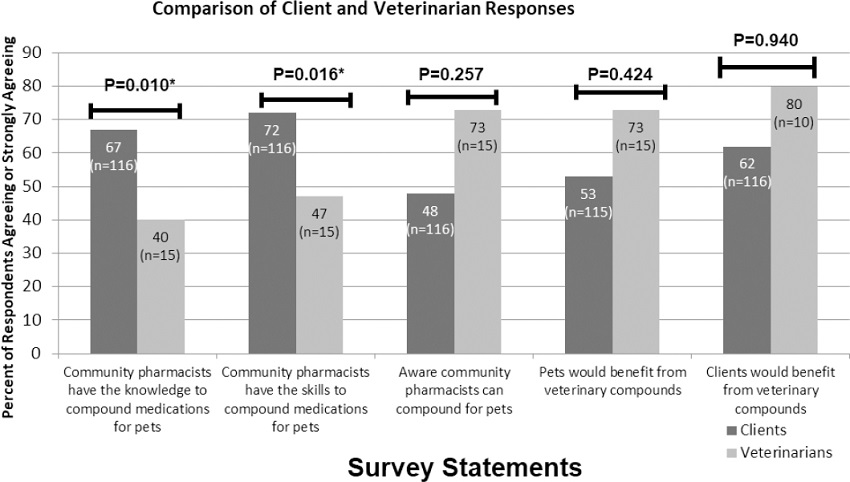 Results: One hundred eighteen clients and 15 veterinarians participated in the study. Seventy-two of 116 clients (62%) and eight of 10 veterinarians (80%) agreed that clients would benefit from veterinary compounds provided in community pharmacies. Only 40% of veterinarians agreed that community pharmacists have the knowledge to compound pet medications, compared to 67% of clients (P=0.010). Similarly, 47% of veterinarians agreed that community pharmacists have the skills to compound pet medications, compared to 72% of clients (P=0.016). Forty-eight of 118 clients (41%) would travel 10 miles or more out of their way for veterinary compounding services at community pharmacies.