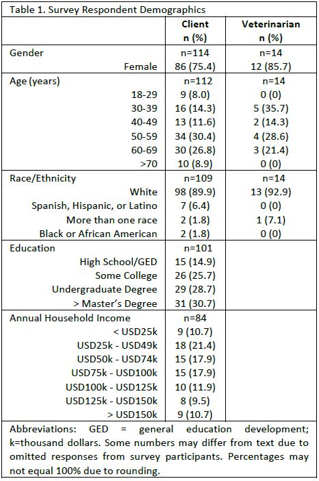 The majority of survey respondents in the client and veterinarian groups were female, 75% and 86% respectively ( Table 1). Additionally, the overwhelming majority of survey respondents identified themselves as being white [98 of 109 (90%) clients, 13 of 14 (93%) veterinarians]. Age was more evenly distributed between groups. Client education and income demographics were also evenly distributed. Veterinarian education and annual household income were not assessed as these were not likely to contribute meaningful information to the study.