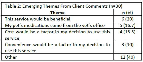 Client and veterinarian comments left in the final free-response survey item were assessed for emerging themes ( Table 2, Table 3). The item invited participants to write any additional comments they wanted to share. Some themes from clients included: clients believe veterinary compounding services would be beneficial and the decision whether or not to utilize the service would be impacted by cost and convenience. Twelve of 30 (40%) client comments that were left did not fit into a theme; some examples included personal experiences with pet medications, while others were not relevant to study objectives. Two of seven veterinarian comments (27%) did not fit into a theme; one provided clarification on the way a veterinarian chose to respond to a previous item, while another discussed some specific medications that they compound in their practice.