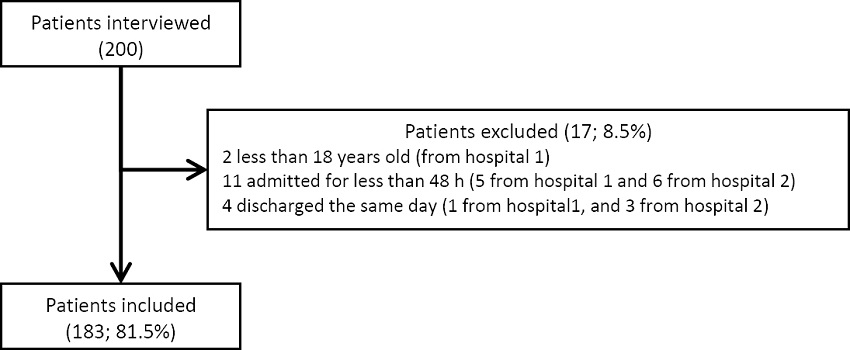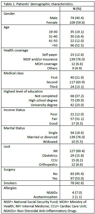 A total of 200 patients were eligible to participate in the study. 82 were selected from the first hospital and 118 from the second hospital. Of them, 183 (91.5%) patients met the inclusion criteria and completed the questionnaire whereas 17 (8.5%) were excluded. The most common reason for exclusion was lack of follow-up due to hospitalization of less than 48 hours ( Figure 1). The mean age was 49 (SD=17.335) [range 19-85]. There was a similar distribution of the gender groups (57.4% females, 42.6% males). Patients were distributed as follows: 127 (69.4%) from IM, 15 (8.2%) from CCU, 29 (15.8%) from obstetrics and 12 (6.6%) were from the orthopedics unit. 53.9% of the patients underwent surgeries (obstetrical, orthopedics, or any type of surgery such as gastric sleeve, appendectomy, etc.). The majority of patients were covered by national social security fund (NSSF) (54.6%) or private insurances (13.1%) or both (8.2%). Around 64% were admitted with health coverage of a second medical class versus 21.9% were from the first class and 13.1% from the third class. 125 patients (68.2%) were given analgesics before admission. The mostly prescribed home analgesics were acetaminophen (53%), ketoprofen (4.9%), ibuprofen (3.8%), diclofenac (3.8%), and tramadol (2.7%) either on regular basis or as required. More baseline characteristics are listed in Table 1.