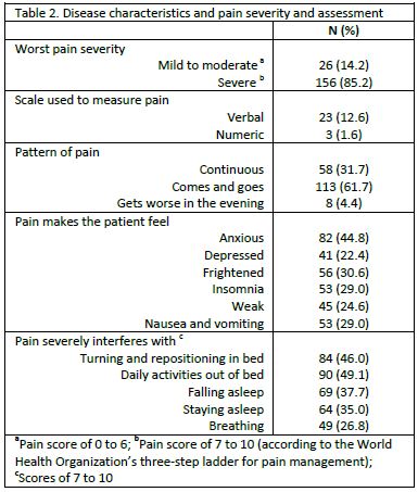 Results from the first day of admission revealed that 82 patients (44.8%) were prescribed one medication, 89 (48.6%) two, nine patients (4.9%) three and one participant only (0.5%) four different pain medications, while two patients (1.1%) were not given any pain medication at all. Adjunct therapy, such as gabapentin was given to one patient whereas hyoscine butylbromide was prescribed for eight patients (4.4%) and phloroglucinol for six patients (3.3%). Acetaminophen, ketoprofen and meperidine were the most frequently reported drug used (95.1%, 34.4%, and 15.3% respectively). Side effects were detected in 34 participants (18.6%). Common side effects were constipation (6%, n=11), nausea/vomiting (4.9%, n=9), heartburn (4.4%, n=8), and dizziness (4.4%, n=8). As for the non-pharmacologic methods for pain relief, they were practiced by 37 patients (20.2%). The most commonly used were distraction (6.6%, n=12), bed rest (6%, n=11), deep breathing (5.5%, n=10), and exercises like walking (4.4%, n=8). Of noteworthy findings, these methods were useful in alleviating pain only in 7.1% of cases. More details about pain characteristics are listed in Table 2.