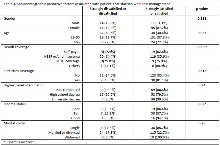 Results have shown that pain scores significantly decreased from an average of 8.34 (SD=1.884) on the first day of treatment to 3.24 (SD=1.611) after 48 hours of follow-up (p<0.001). In general, the majority of patients reported to be satisfied (68.3%, n=125) and 30 patients strongly satisfied (16.4%) regarding pain management therapy. Only 28 patients (15.3%) were either dissatisfied or strongly dissatisfied. When comparing between categories of pain severity, it was shown that 25 patients (16.2%) with mild to moderate pain were satisfied or strongly satisfied versus 129 (83.8%) with severe pain. Again, only one patient with mild to moderate pain was either dissatisfied or strongly dissatisfied when compared to 27 patients (96.4%) with severe pain. This trend failed to show any statistical significance (p=0.078).