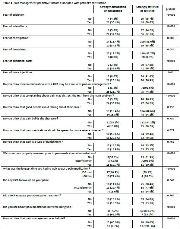 As for patients’ perceptions, fear of addiction and side effects such as constipation or drowsiness were significantly associated with patient dissatisfaction (p<0.001). Again, 66.1% and 76.9% of those who were afraid of additional costs and injections were considered satisfied or strongly satisfied when compared to those who were not afraid [90 (97.8%) and 74 (91.4%); p<0.001 and p=0.001 respectively]. Moreover, only 64.2% who believed that complaining about pain may lead to distraction of the HCP were satisfied versus 96.8% with no such belief (p<0.001). The same trend was shown with the patients who believed that good communication between the patient and the HCP is important for appropriate pain management (p<0.001).