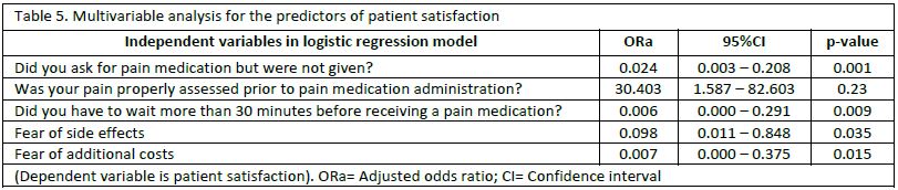 A multivariable analysis for patients ‘satisfaction with all variables with p<0.001 was done: (1) Patients perceptions and opinions such as fear of addiction, additional costs and side effects, in addition to lack of communication between HCPs and the patients as well as fear of distracting HCPs by complaining about pain were also taken into consideration. (2) Pain assessment methods such as proper assessment of pain by a HCP, waiting more than 30 minutes before receiving pain medications and asking for analgesics but not being provided. The stepwise forward approach was adopted. Five models were obtained; the Omnibus Tests of Model Coefficients was found significant (<0.001) suggesting that the model is fit and suitable to the data. The Hosmer and Lemeshow goodness-of-fit test was found to be non-significant (0.175) emphasizing that the model is fir with its data. The overall percentage from the classification table was 95.8% suggesting that the entered variables could explain more than 50% of the variability of the dependent variable. The Nagelkerke R square was 0.762 indicating that 76.2% of the variation of patient satisfaction is due to the variation of the independent variables included. Results of both significant and non-significant variables in the equation are presented in Table 5. Results have shown that patients’ satisfaction significantly decreased because of some prejudgments such as patients’ fear of side effects (aOR=0.098) and additional treatment costs (aOR=0.007). When it comes to the involvement of HCPs in the therapy, it was shown that satisfaction significantly decreased when the patient had to wait for more than 30 minutes before getting the analgesic (aOR=0.006) or if he/she asked for additional therapy but were was not given (aOR=0.024). Proper pain assessment and asking about pain intensity by a HCP significantly increased patient’s satisfaction (aOR=30.403).