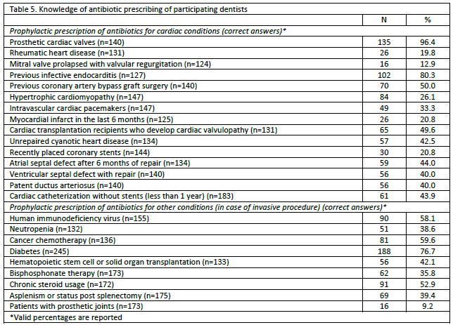 This study raises many questions to be explored in future endeavors. First, as found in previous publications 15, 18, 20, the majority of dentists were aware of the contribution of dentistry-based antibiotic prescribing to the problem of antibiotic resistance at the national level, and the vast majority of them acknowledged either over, extended and/or misuse of antibiotics as causes of antimicrobial resistance. It was noted that in our sample more importance was accorded to preventing and treating infections rather than preventing antimicrobial resistance. In fact, qualitative data from the United Kingdom indicate that while dentists are aware of the theoretical contribution of dentistry-based prescribing to the emergence of resistance, they perceive it to be far less incriminated than the contribution of their medical col¬leagues. 18 This might partly explain the conflicting results emanating from our study. Second, our sample exhibited high referral of pregnant and lactating women, as well as cardiac patients to specialist physicians, when antibiotic prescription is needed. This behavior possibly denotes the limited knowledge, capacity or time of participants to take in charge these critical conditions, or could be regarded as part of the multidisciplinary approach to patient care. Available data do not permit us to generate a conclusion. The study relied on self-reported practices and the answers were not verified against patient records. Participants might have provided more professionally desirable answers, probably resulting in an underestimation of the true prescribing levels. Future studies should consider auditing patient records to provide documented data and ensure accuracy. Another limitation of this study is the absence of published national treatment guidelines of antibiotics prescription in dental practice and the use of international guidelines to assess conformity which may have created some underestimation of the conformity. Moreover, telephone interviews may have underestimated the real percentage of antibiotic prescription. Finally, we used a systematic random sample which also limits the selection bias. In spite of this, the low response rate may affect the external validity.