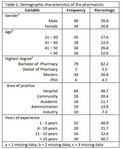 A total of 144 pharmacists returned the survey (72% response rate). However, 17 questionnaires were excluded from analysis because respondents did not answer more than 30% of the questions [ 8]. In the end 127 questionnaires were included in the analysis and the majority was male (70.9%) respondents. Only 40 pharmacists (31.5%) had a postgraduate degree (Masters and Doctor of Philosophy). Table 1 illustrates the demographic characteristics of the participants.