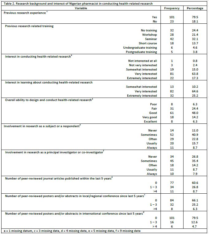 Conclusion: Nigerian pharmacists indicated interest to participate in health-related research. However, self-competence and confidence to plan and conduct research were low. This was particularly so for skills related to statistical analysis. Training programs and building of Pharmacy Practice Research Network are recommended to enhance pharmacist’s research capacity.