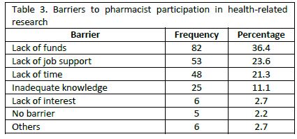 Several barriers to pharmacist participation in health-related research were identified. Lack of fund was the most common barrier (36.4%). This was followed by lack of job support (23.6%), lack of time (21.3%) and inadequate knowledge (11.1%). Table 3 shows the barriers to pharmacist participation in health-related research.