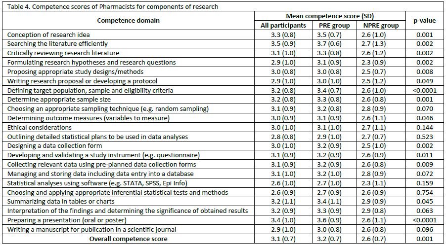 Pharmacists with PRE had higher competence and confidence scores than those with NPRE. This is consistent with a previous study, which concluded that pharmacists with PRE were more confident in their research skills, and ability to read and evaluate research papers. 13 In addition, pharmacists with PRE are more likely to participate in research with minimal supervision and are more influential in convincing colleagues to change practice based on sound research evidence. 12, 14 This underlines the need to train and expose undergraduate and postgraduate pharmacy students to research. Such action would stimulate interest in research, and prepare students to become independent researchers and evidence based practitioners. Moreover, research participation provokes critical thinking, improve problem-solving skills and decision making during pharmacotherapy. 4