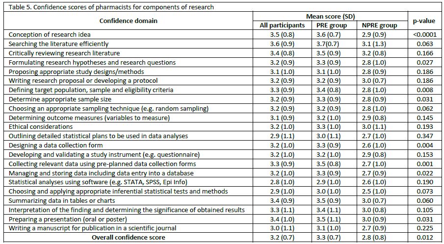Pharmacists in the PRE group had significantly higher confidence scores for conception of research idea (3.6; SD=0.7 versus 2.9; SD=0.9, p<0.0001); formulation of research hypothesis and research question (3.3; SD=0.9 versus 2.8; SD=1.0, p=0.027); and definition of target population, sample and eligibility criteria (3.4; SD=0.8 versus 2.8; SD=1.0, p=0.008), than those in NPRE group. The PRE group had higher overall confidence score (3.3; SD=0.7) than those in the NPRE group (2.8; SD=0.8). Table 5 shows the confidence scores for all the pharmacists and the comparison of the scores between the PRE and NPRE groups. Logistic regression analysis revealed that the only predictor of moderate-to-extreme self-confidence score was publication of at least one article in peer review journal during the last five years (OR:5.0; 95%CI: 1.336 – 18.811; p=0.017) Gender, years of experience, previous research experience, previous research related training, having an abstract in local/regional or international conference were not significant predictors of moderate-to-extreme self-confidence score (online supplementary material).
