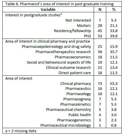Most of the pharmacists indicated interest in postgraduate training. About 40% of the pharmacists was interested in pursuing Doctor of Philosophy (PhD). In addition, 33.8% and 21.1% of the pharmacists wish to enroll in fellowship/residency and Masters respectively. Within the discipline of clinical pharmacy and practice, interest was high for pharmacotherapeutic (35.7%), and pharmacoepidemiology and drug safety (15.9%) research. Table 6 shows pharmacist’s area of interest in postgraduate training.