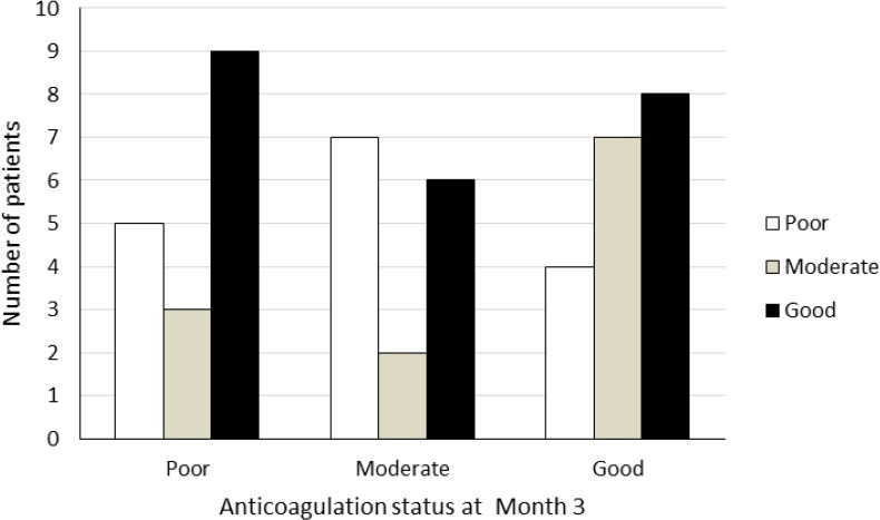 At month three the proportions of patients in good, moderate and poor anticoagulation status were 19, 15, 17 respectively. By six months the proportions changed to 23, 12 and 16 respectively. With some patients improving and some deteriorating, the overall anticoagulation status remained the same from month three to month six (McNemar-Bowker pairwise chi-square=3.60; degrees of freedom=3; p=0.31).