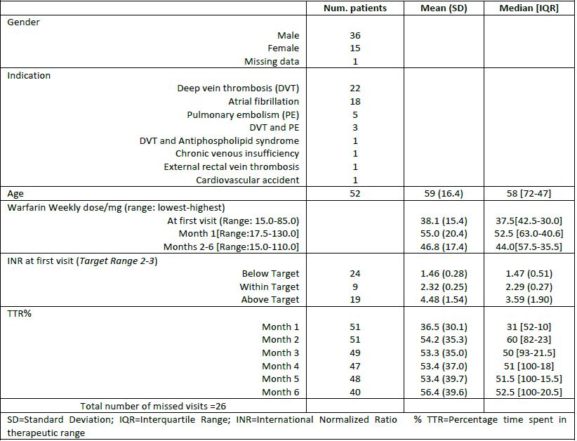 Results: For the period of assessment, 52 patients were identified; the median age was 58 years and 36 patients were males. Deep vein thrombosis was the main indication for therapy (22 of 52) and median warfarin weekly dose ranged was 15.0-130 mg. At time of recruitment most of the patients were outside the target INR range (43 of 52). Within one month, the median TTR attained was 31% [IQR 62-10]. This significantly improved by second month to 60% [IQR 82-23] (p=0.001). By month three, the proportion of patients in good, moderate and poor anticoagulant status was 19/51, 15/51 and 17/51 respectively, which at six months changed to 23/51, 12/51. 16/51 respectively; thus, although coagulation status improved from month one to three, there was no significant improvement from month three to month six (p=0.31).
