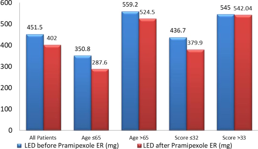 Conclusions: This study demonstrated the efficacy of Pramipexole ER on decreasing the total levodopa equivalent dose (LED).The role of health care professionals is to maintain the patient on the lowest effective levodopa equivalent daily dose and optimize the treatment therapy, thus decreasing the side effects that might arise from overdosing of antiparkinsonian drugs.