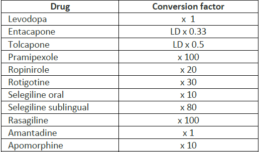 Levodopa and dopamine agonists are considered essential options in early and advanced PD treatment guidelines. 5, 6 Among all multiple antiparkinsonian therapies that are now available, the standardized levodopa equivalent dose (LED) is set to provide a useful tool to compare dose intensities of different medications in clinical trials. It is the dose that produces the same antiparkinsonian effect as 100 mg of immediate release levodopa. 7