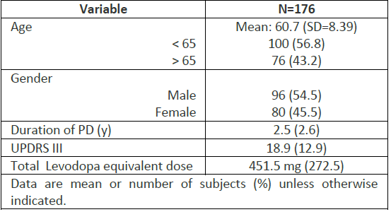 Out of 176 patients 54.5% were males and 45.5% were females. The mean age of the patients ranged from 27-88 was 60 years old (SD=8.1), 56.8% were less than or equal to 65 years. Regarding the disease duration, the mean was 2.5 years (SD=2.4). The mean baseline LED was 451.5 mg and the mean baseline UPDRS-III score was 18.99 points (SD=12.7) with 86.3% of patients less or equal to 30. ( Table 2)