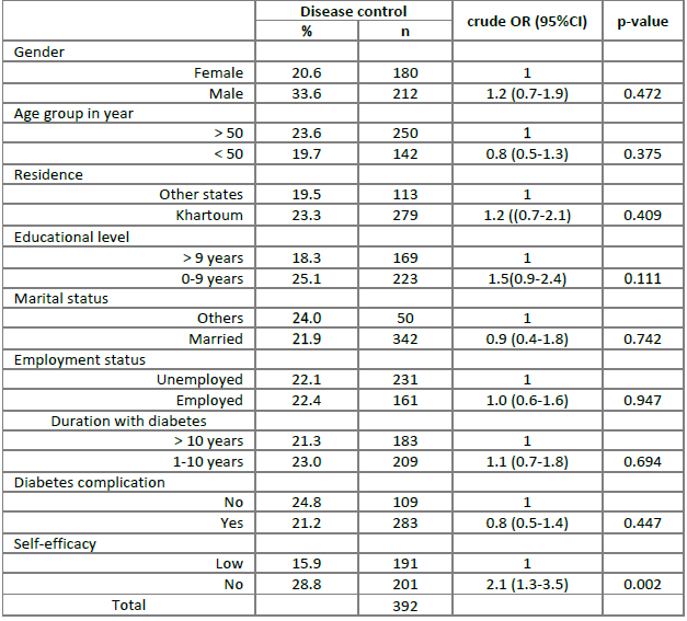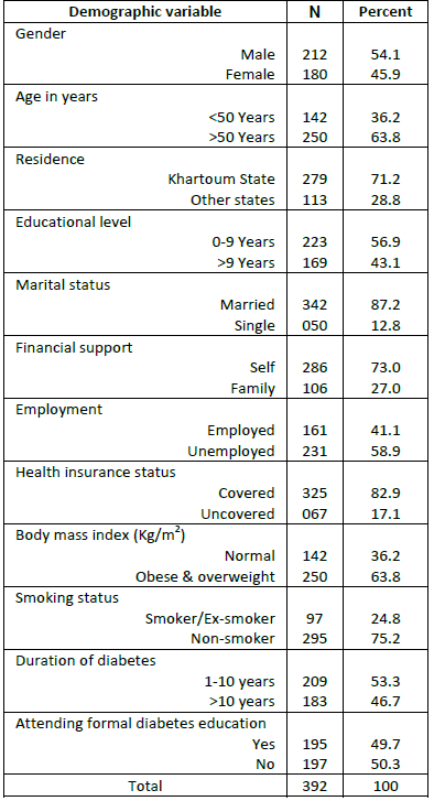 A total of 392 patients were included, with 335(85.5%) recruited from Jabir Abu Elizz Diabetes Centre and 57 (14.5%) from Soba Teaching Hospital. Male patients were 212 (54.1%) and 250 (63.8%) aged over 50 years. More than half of the participants attained an educational level between 0-9 years and 49.7% attended formal diabetes education sessions. Obese and overweight were 250 (63.8%). Table 1 showed participants characteristics.