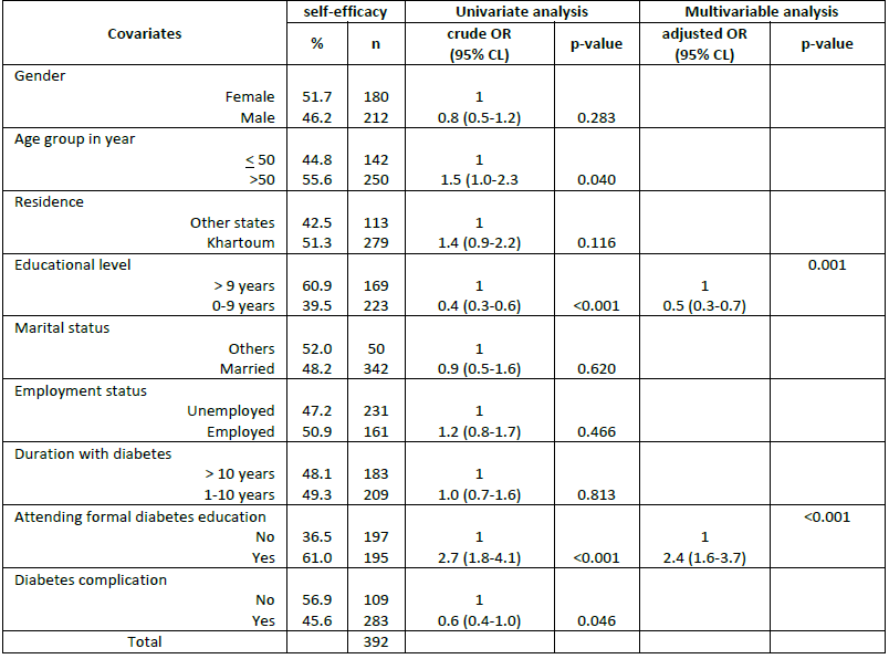 Methods: A cross-sectional study was conducted at two health care facilities in Sudan from April to May 2016. Patients with type 2 diabetes mellitus were included. Convenience sampling method was adopted. Diabetes Management Self-Efficacy Scale and the Revised Summary of Diabetes Self-care Activities were used to collect data through a face-to-face interview. Logistic regression analysis was performed. A p value <0.05 was considered to be significant. Data were processed using the software SPPS v 21.0.