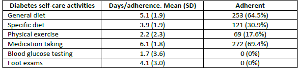 Among the participants, 253 (64.5%), 121 (30.9%), 69 (17.6%) and 272 (69.4%) were classified as adherent to general diet, specific diet, physical exercise and treatment plan, respectively. Table 3 shows the mean number of days and the level of adherence to diabetes self-care activities.