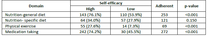 As shown in Table 4, patients with high self-efficacy to manage nutrition, physical exercise activity and medication were found to be more adherent to general diet, exercise activity and medication taking, respectively, compared to those with low efficacy to manage these domains.