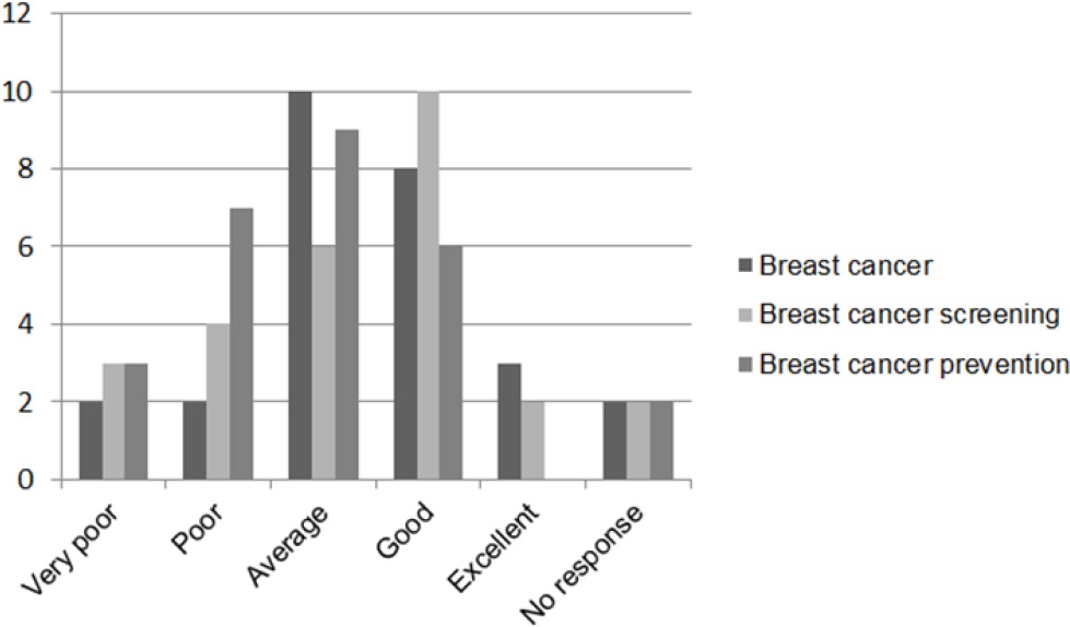 The findings of this research suggest community pharmacists’ knowledge in relation to bowel cancer and breast cancer topics is relatively good despite their perception. This is a novel finding. In the literature searches conducted for this paper, only one previous study from Australia measured pharmacists’ knowledge and this was according to indicators for referral for bowel cancer screening. The findings indicate pharmacists’ knowledge to be variable, with pharmacists correctly identifying consumers to be referred for screening between 30% and 70% of the time. 19 International literature finds pharmacists’ knowledge in relation to breast cancer and screening to be poor to moderate, however pharmacists are generally enthusiastic to improve their knowledge. 27- 29, 34