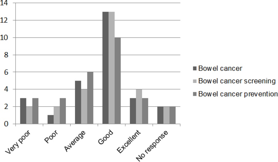 In the survey, most community pharmacists described their confidence as ‘average’ or ‘good’ when discussing breast cancer (67%, n=18), breast cancer screening (60%, n=16) and breast cancer prevention (56%, n=15). See Figure 2. Many community pharmacists described their confidence as ‘average’ or ‘good’ when discussing bowel cancer (67%, n=18), bowel cancer screening (63%, n=17) and bowel cancer prevention (60%, n=16). See Figure 3. Community pharmacists were more likely to describe their confidence as ‘excellent’ in relation to the bowel cancer topics and as ‘very poor’ in relation to the breast cancer topics.