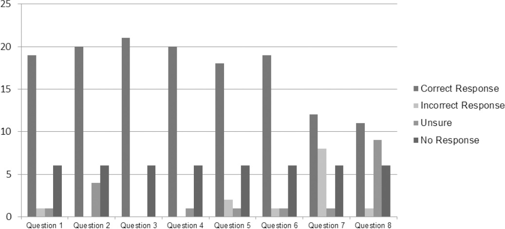 Despite reporting only moderate confidence in discussing breast cancer and bowel cancer with their consumers, the survey demonstrated community pharmacists’ knowledge about bowel cancer and breast cancer topics is acceptable. In the eight knowledge questions about cancer and cancer screening, an average of 82% responded with a correct answer (range: 52% (n=11 [Question 8]) and 100% (n=21 [Question 3])). Again, community pharmacists were more likely to report correct answers in relation to bowel cancer topics than they were in relation to breast cancer topics. See Figure 4.
