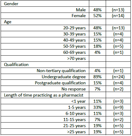 The electronic survey was completed by 27 pharmacists (13 males, 14 females). See Table 1. Almost half (48%) of the respondents were aged 20-29 years and most (89%) had an undergraduate degree. Community pharmacists had been practicing for <1 year (11%), 1-5 years (33%), 6-15 years (18%), or over 21 years (38%). Five community pharmacists participated in an in-depth interview. This paper presents the findings from three themes, which emerged from this data: (1) pharmacists’ perceptions of their health promotion role, (2) pharmacists’ descriptions of their current health promotion role and (3) pharmacists’ knowledge and confidence in their health promotion role. These themes relate to community pharmacists’ perceptions of their health promotion role generally, and to their role in promoting bowel cancer and breast cancer screening specifically.