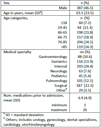 During the study period, a total of 999 medication reconciliations were performed, all occurring within 24 hours of hospital admission. Sixty-three medication reconciliation interviews were excluded on account of the patients being re-hospitalized within the study period. A further 104 patients were excluded because they did not use medication before admission. Thus, 832 patients were included in the analyses ( Table 1).