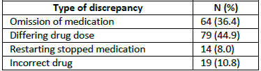 Conclusions: Of the total number of patients, 11.7% experienced one or more medication discrepancies following admission to the hospital. Elderly patients taking multiple drugs were found to be particularly at risk.