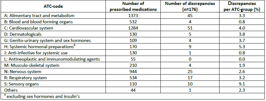 In 97 of the 832 patients, at least one medication discrepancy was detected (11.7%). A total of 176 medication discrepancies were identified in these 97 patients, which gives a frequency of 0.21 discrepancies per admission and 1.8 discrepancies per admission with at least one medication discrepancy. The prescribing of an incorrect drug dose was found to be the most common discrepancy type, followed by the omission of medication ( Table 2). Drugs most frequently involved in medication discrepancies pertained to the ATC groups ‘Systemic hormonal preparations’, ‘Cardiovascular system’ and ‘Sensory organs’ ( Table 3).
