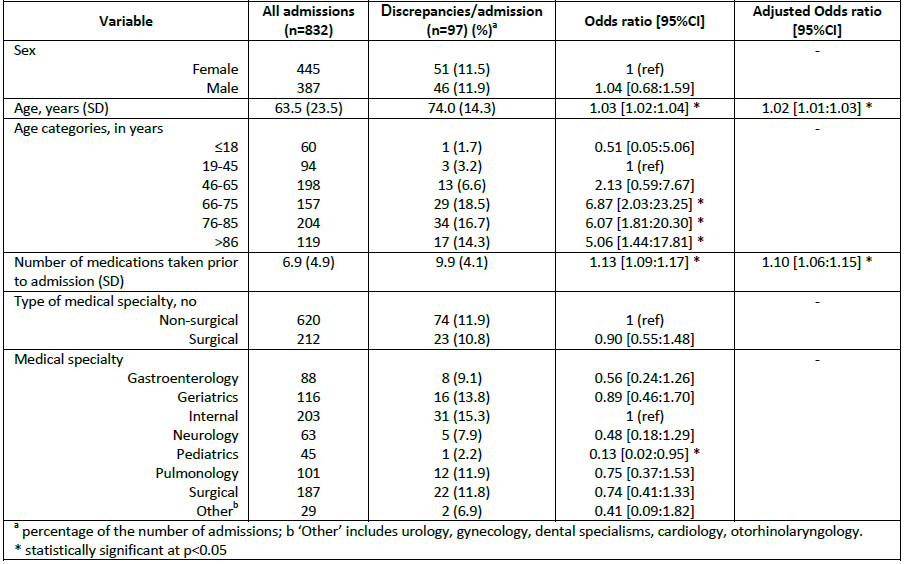Results: At least one medication discrepancy was found to have occurred with 97 of the 832 patients (11.7%), the most common discrepancies involving incorrect drug dose (44.9%) and omission of medication (36.4%). In the univariate analysis, age (OR=1.03 [95% CI 1.02:1.04] p<0.001) and number of pre-admission medications taken (OR=1.13 [95%CI 1.09:1.17] p<0.001) were revealed to be significantly associated with the risk of medication discrepancies. Sex, type of medical specialty, and surgical versus non-surgical specialty were found not to be significantly associated with discrepancies. In the multivariate analysis, both the number of pre-admission medications (OR=1.10 [95%CI 1.06:1.15] p<0.001) and age (OR=1.02 [95%CI 1.01:1.03] p=0.004) were independently associated with the risk of medication discrepancy.
