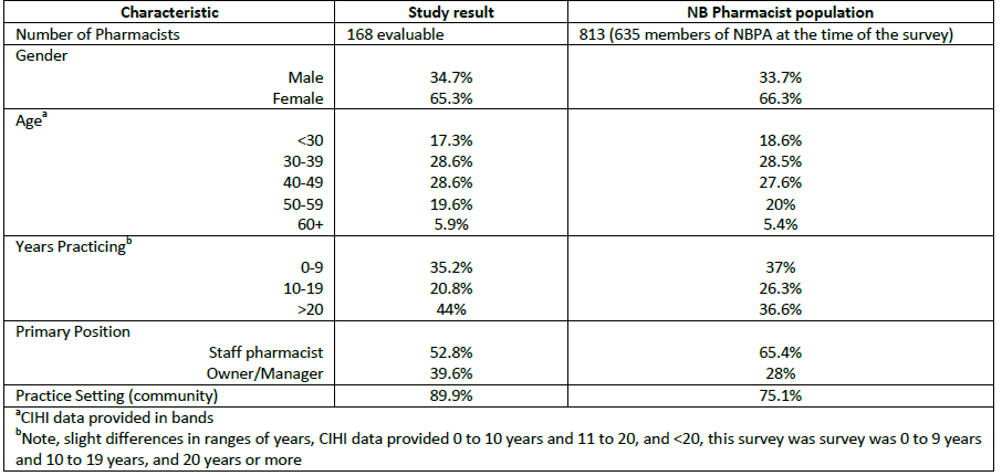 The authors would like to thank Nicholas Edwards and Tania Alia for their assistance with survey development and administration, Emma Murray for her assistance with manuscript preparation, and the New Brunswick Pharmacists’ Association for their support and assistance with administration of the questionnaire. The authors would also like to thank the American Pharmacists’ Association (APhA) for sharing their previous survey instrument, which we adapted for our study.