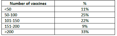 Over 93% of respondents indicated that they currently administer vaccines in their practice with nearly 80% of them providing immunizations “often” or “always”. Most patients immunized by pharmacists were adults 18 years of age and older with respondents indicating less than 20% (on average) of vaccines administered were to those less than 18 years of age. Approximately 27% of respondents were immunizing for 1 year or less, 49% for 1 to 3 years and 25% for over 3 years. The number and type of vaccines administered in the last year varied between respondents ( Table 2 and Table 3). Of the estimated 15,000 vaccines administered based on self-reporting by respondents since they began immunizing, seven adverse events were reported, 6 were vasovagal and 1 was suspected anaphylaxis. All were managed appropriately based on the written responses.