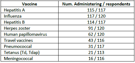 Results: Responses from 168 (response rate of 26%) were evaluable. Approximately 90% of respondents worked in community practice full time, 65% were female and 44% were practicing for 20 or more years. Greater than 75% reported administering: hepatitis A and B, influenza, and zoster vaccines. The majority of respondents felt fully accepted (agreed or strongly agreed) as immunization providers by patients, local physicians, and the provincial health department (97%, 70%, and 78%, respectively). Most commonly reported barriers were: lack of a universally funded influenza immunization program, insufficient staffing and space, and concerns around reimbursement for services.