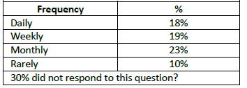 Likert scales were a 5-point scale that ranged from Strongly Disagree to Strongly Agree for agreement with statement questions and for frequency of activity questions, the options were “Never”, “Rarely”, “Sometimes”, Often”, and “Always”. A copy of the survey may be obtained by contacting the corresponding author.