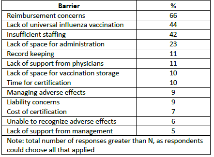 Survey respondents were asked to identify barriers they perceived to providing immunization services from a list of possible barriers, in which they could check all that they felt applied, as well as the option to write-in additional barriers, which are presented in Table 5. Four key barriers identified through quantitative (Figure 4) and qualitative responses (not shown) were: 1) concern about reimbursement, 2) lack of a universal influenza program (reimbursement concerns), 3) insufficient staffing and 4) lack of space for vaccine administrations within the pharmacy.