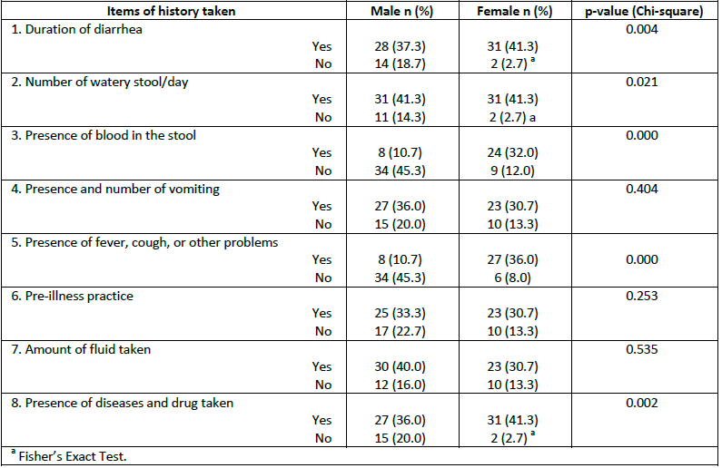 To take a complete patient history from patients presenting with acute diarrhea, a wide range of questions need to be asked. 22, 23 These would usually include onset of symptoms and duration, presence of other illnesses or symptoms, severity and frequency of diarrhea, in addition to the type of stool (e.g. watery, bloody, purulent or mucus-filled). Patients should also be investigated for fever, vomiting, dehydration, urine output dizziness and thirst. However, in most cases of non-severe illnesses, it is not necessary to determine the exact cause of diarrhea. 30 Most of the questions asked during history taking by the pharmacists in this study covered at least half of the items on the study checklist, suggesting that the practice among the community pharmacists in this study were somewhat satisfactory. Most of the pharmacists asked patients about the eight items in history taking. Female pharmacists in this study also had better total history taking scores than their male counterparts. While there is some evidence that feminine characteristics such as communication and empathy are beneficial in patient care 31, other studies have also reported no differences between the genders in thinking and clinical reasoning when supplying medication. 32 As recommended in the best practice, most frequent questions asked during the history taking were number of watery stool; duration of diarrhea, presence of diseases and drug taken, amount of fluid taken, presence and number of vomiting, and pre-illness practice.