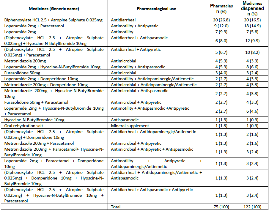 Results: All of the 75 pharmacies visited were managed by professionally qualified pharmacists. The most common questions asked during history taking were number of diarrheal episodes (n=62; 82.7%); duration of symptoms (n=59; 78.7%) and presence of other diseases and if any drug had been taken (n=58; 77.3%). Female pharmacists had a higher total mean score (6.45, SD=1.33) for history taking when compared to their male counterparts (4.34, SD=2.13); p <0.001. Medicine combination of diphenoxylate HCl 2.5mg + atropine sulphate 0.025mg (n=34; 27.9%) was most frequently dispensed while the least was oral rehydration salt (n=1; 0.8%). Around 20% (n=15) of pharmacists dispensed antimicrobial agents. Over half (n=46; 61.3%) of pharmacists indicated the frequency of use on the medicine packet. Conversely, less than half (n=33; 44.0%) gave any advice on food and fluid intake.