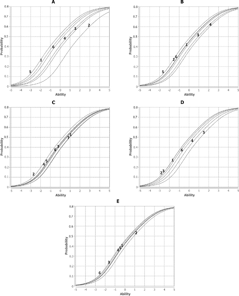 To evaluate subscale A, it was shown that a person with an ability score of -1 obtained the probability of a correct response of 0.4 to answer item A 5 (see curve 5 of subscale A on Figure 1). Curve A 2 yields a probability score of 0.45 for an ability score of 1.5. Therefore, it could be seen that A 5 was easier than A 2. In addition, the distance between the curves of subscale A had the most complete and clearest separation, reflecting a good difference in difficulty of items in this scale. Difference in difficulty level of items in scale E was the worst because the curves were close together and even curves 1, 4, and 5 seemed to overlap. Similarly, items B 2, B 6, C 7, C 1, D 2, and D 3 had a poor distinction in difficulty level. However, overlapping items could play a different role in measuring the variety of aspects in each subscale.